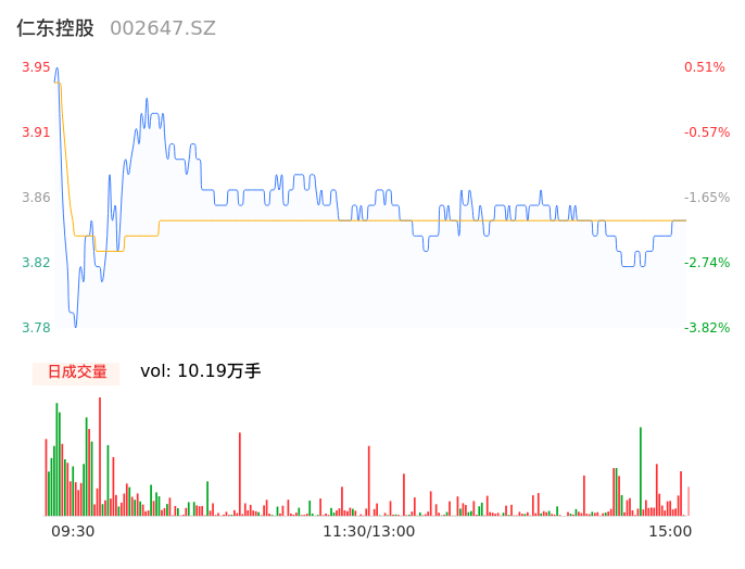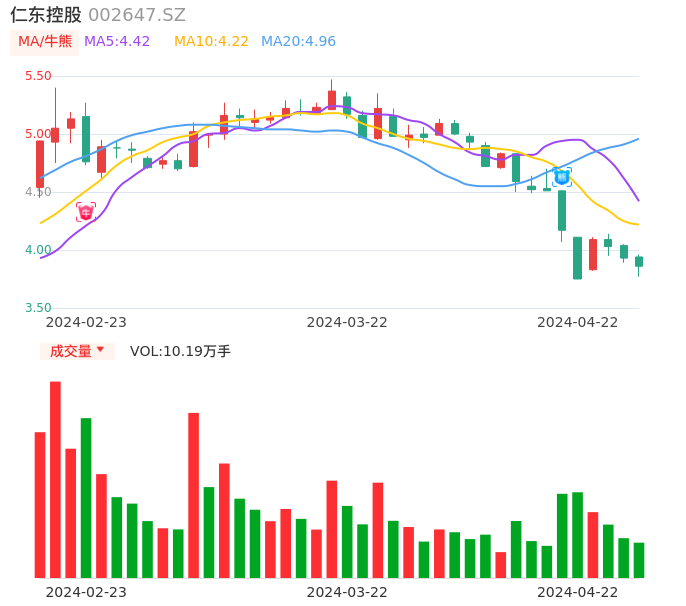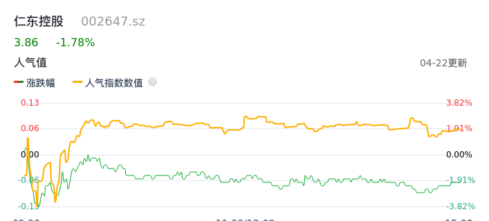04月22日,仁东控股收报3.86,股价涨幅-1.78%,成交金额3922.54万元,换手率1.82%。