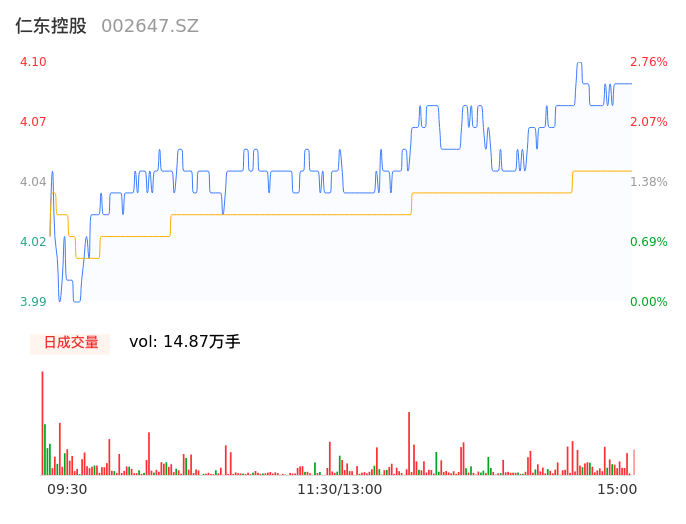 04月26日,仁东控股收报4.09,股价涨幅2.51%,成交金额6024.07万元,换手率2.66%。