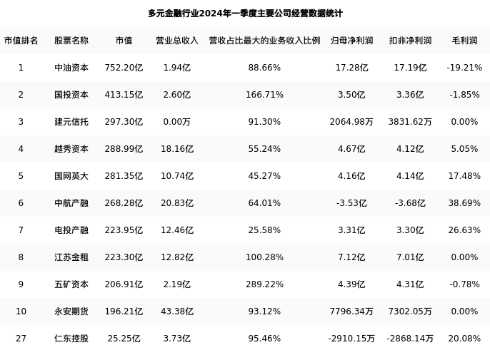 仁东控股最新报告期数据为一季度,下表汇总了多元金融行业内市值靠前的公司一季度主要经营数据