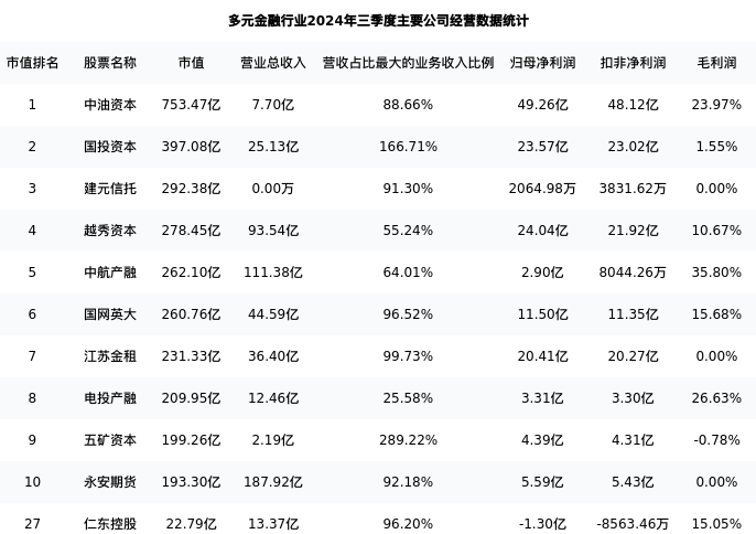 仁东控股最新报告期数据为三季度,下表汇总了多元金融行业内市值靠前的公司三季度主要经营数据