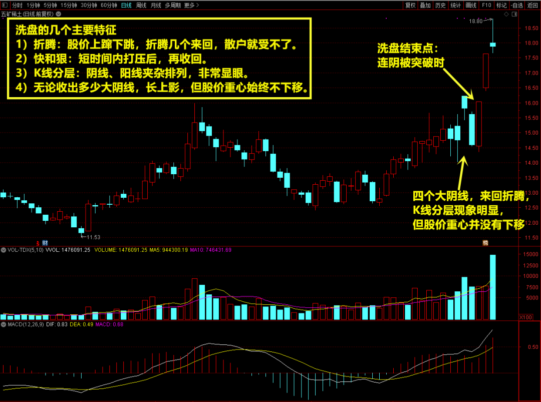 1)折腾:洗盘最大的特征就是“瞎折腾”,股价上蹿下跳,折腾几个来回,散户受不了自然就卖出了。