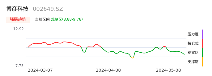 我们来看一下该股的九方特色指标强弱趋势的情况:博彦科技自04月29日从持仓区下穿到观望区,股价近期持续走弱。短期已经进入空头行情,且下跌动能仍未衰竭。建议继续谨慎观望。