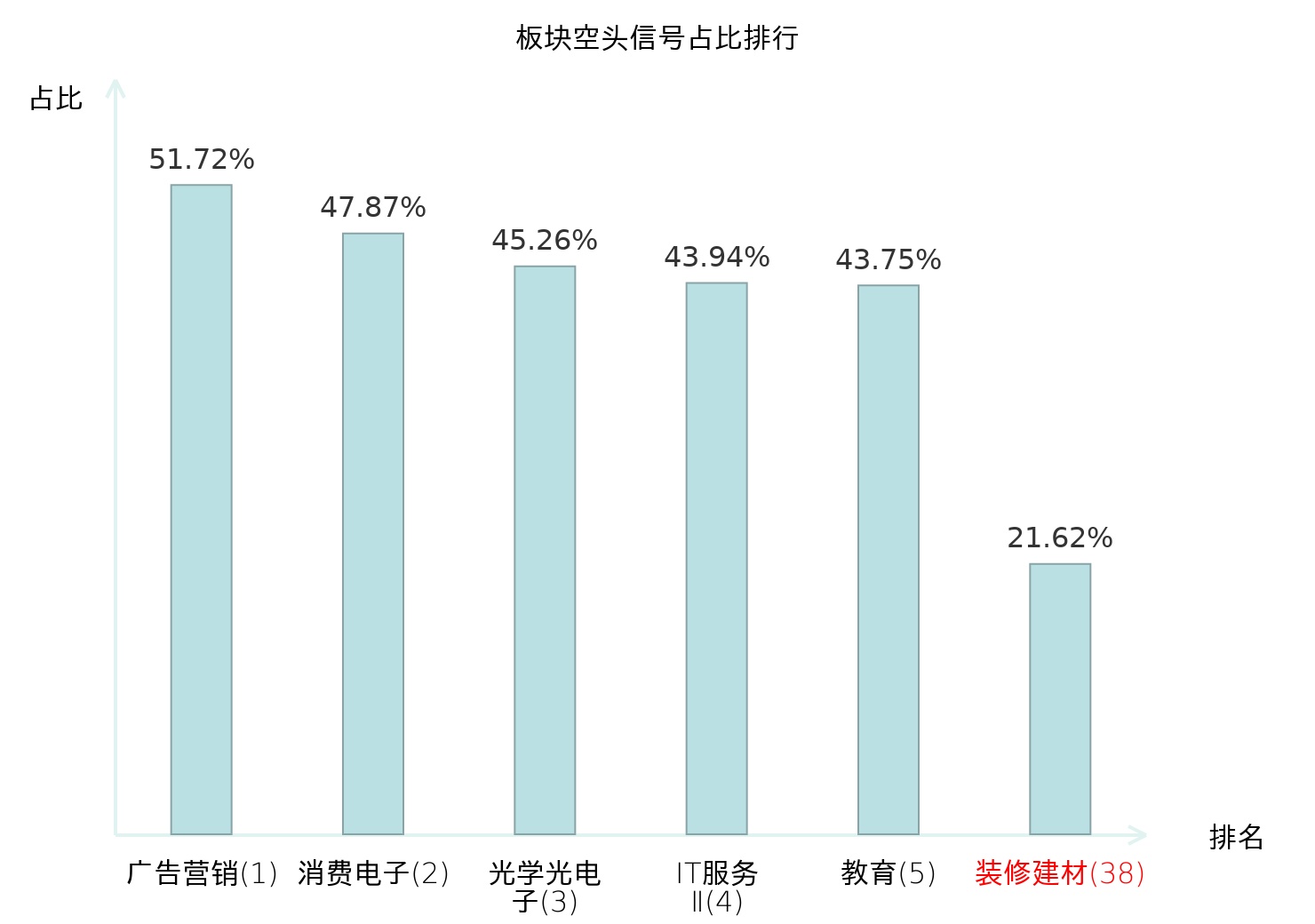 全市场所有行业板块中主力空头信号占比排名中,广告营销板块位居第一。广告营销板块名次提升最快,较昨日上升115位。
