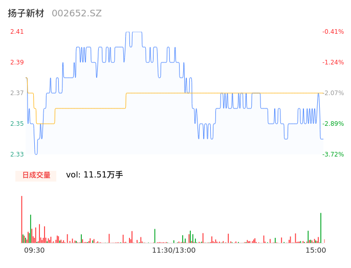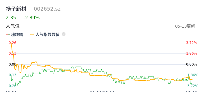 05月13日,扬子新材收报2.35,股价涨幅-2.89%,成交金额2722.34万元,换手率2.25%。