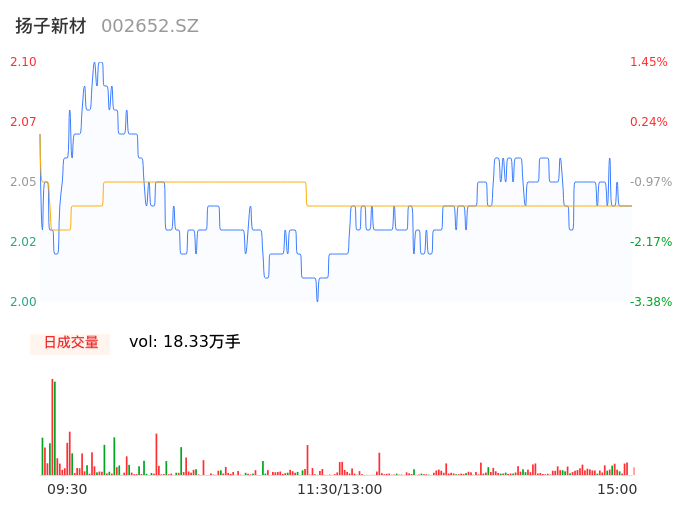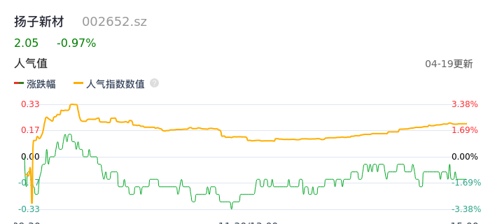 04月19日,扬子新材收报2.05,股价涨幅-0.97%,成交金额3745.54万元,换手率3.58%。