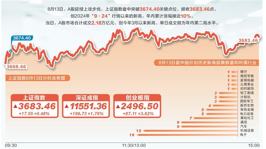 8月13日,A股延续上攻步伐,上证指数盘中突破3674.40关键点位,收盘涨幅0.48%,报收3683.46点,创2024年“9·24”行情以来的新高,年内累计涨幅接近10%。深证成指、创业板指、科创50指数也缓步上行,逼近“9·24”行情以来的高点。