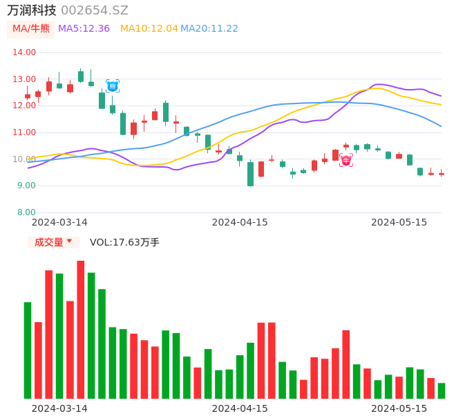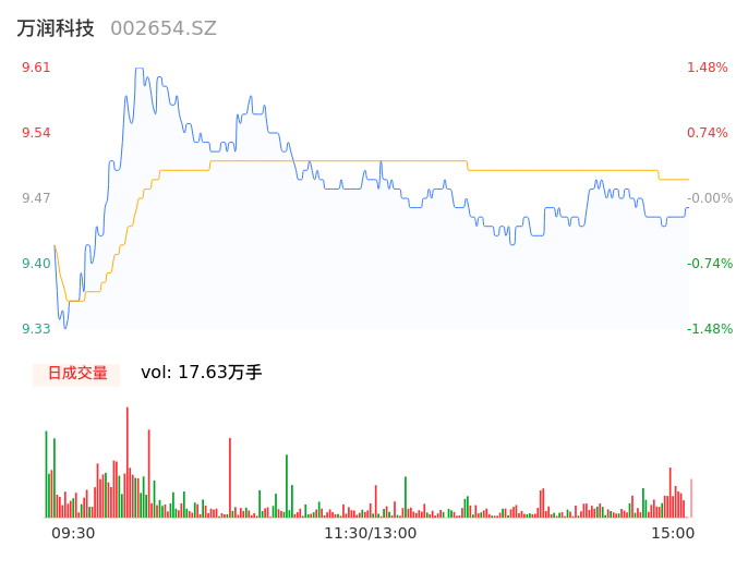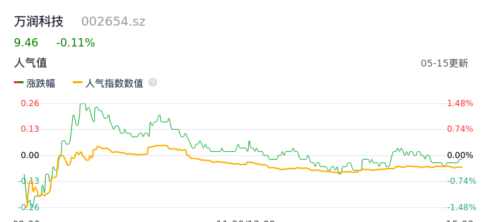 05月15日,万润科技收报9.46,股价涨幅-0.11%,成交金额1.67亿元,换手率2.25%。