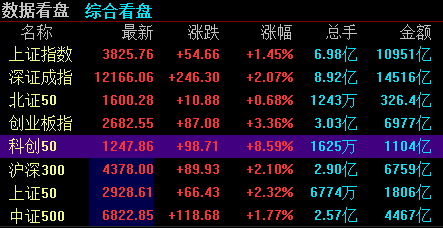 截止收盘指数全线收红,在周四冲高回落砸了一波之后,今天反包大涨。科创50涨超8%,创业板紧随其后涨超3%。就连上证都涨了1.4%。