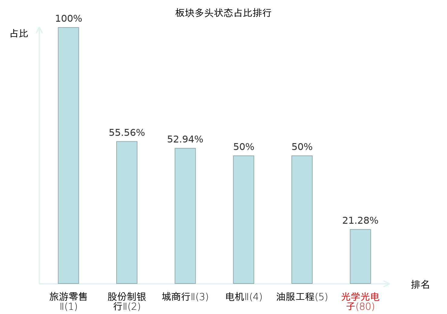 全市场所有行业板块中主力多头状态占比排名中,旅游零售Ⅱ板块位居第一。互联网电商板块名次提升最快,较昨日上升65位。