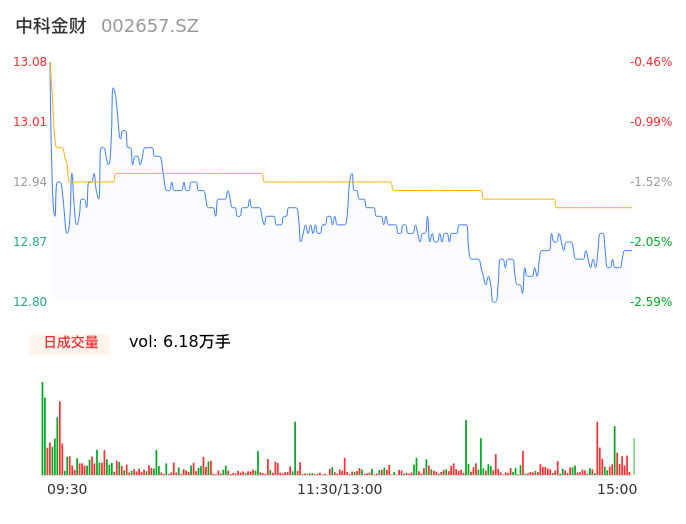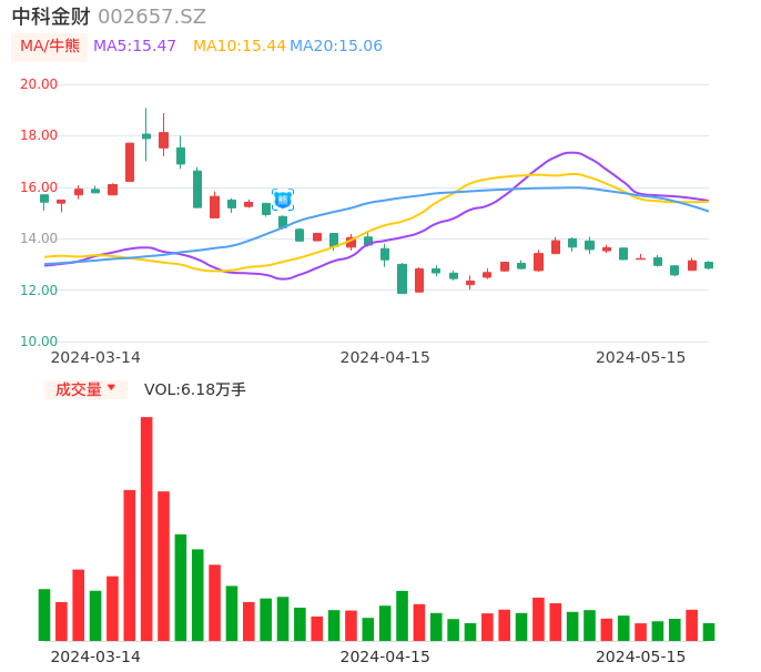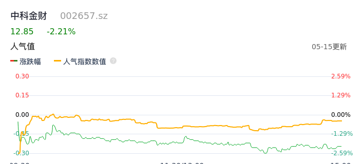 05月15日,中科金财收报12.85,股价涨幅-2.21%,成交金额7969.05万元,换手率1.84%。