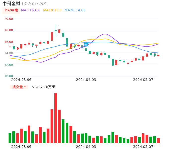 05月07日,中科金财收报13.65,股价涨幅0.52%,成交金额1.06亿元,换手率2.32%。