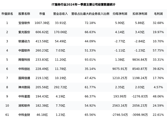 中科金财最新报告期数据为一季度,下表汇总了IT服务行业内市值靠前的公司一季度主要经营数据