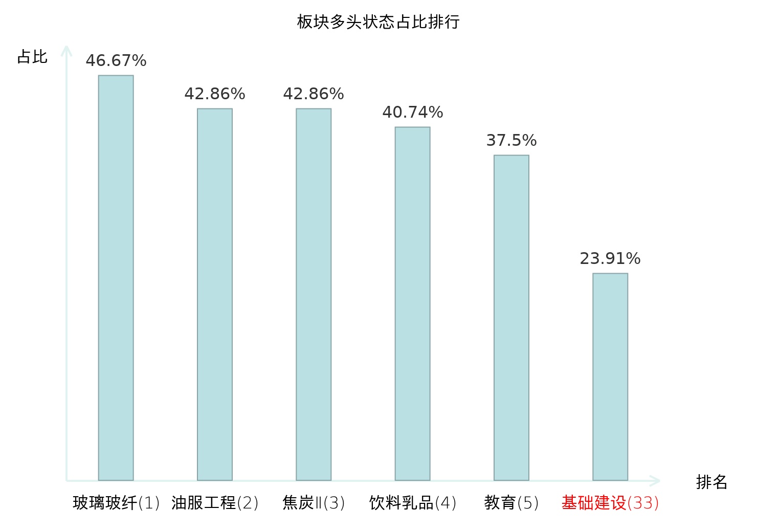 全市场所有行业板块中主力多头状态占比排名中,玻璃玻纤板块位居第一。航空机场板块名次提升最快,较昨日上升43位。