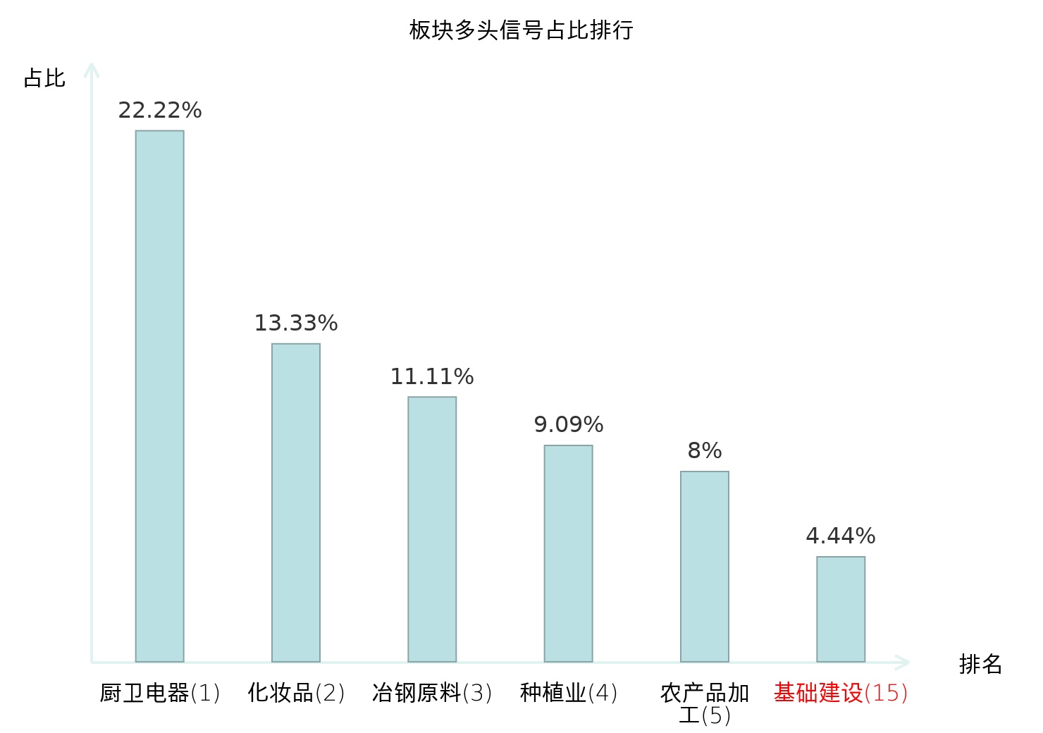 全市场所有行业板块中主力多头信号占比排名中,厨卫电器板块位居第一。化妆品板块名次提升最快,较昨日上升104位。