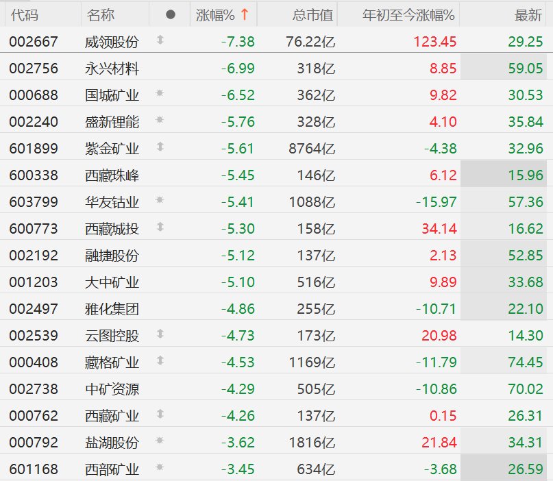 A股异动丨锂矿股集体下挫,威领股份跌超7%,永兴材料跌超6%