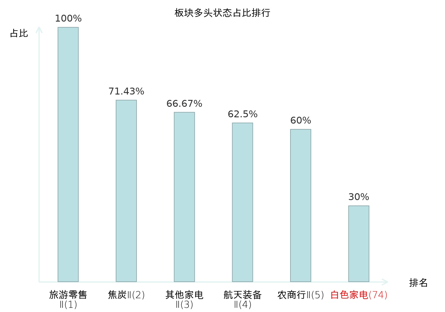 全市场所有行业板块中主力多头状态占比排名中,旅游零售Ⅱ板块位居第一。白酒Ⅱ板块名次提升最快,较昨日上升50位。