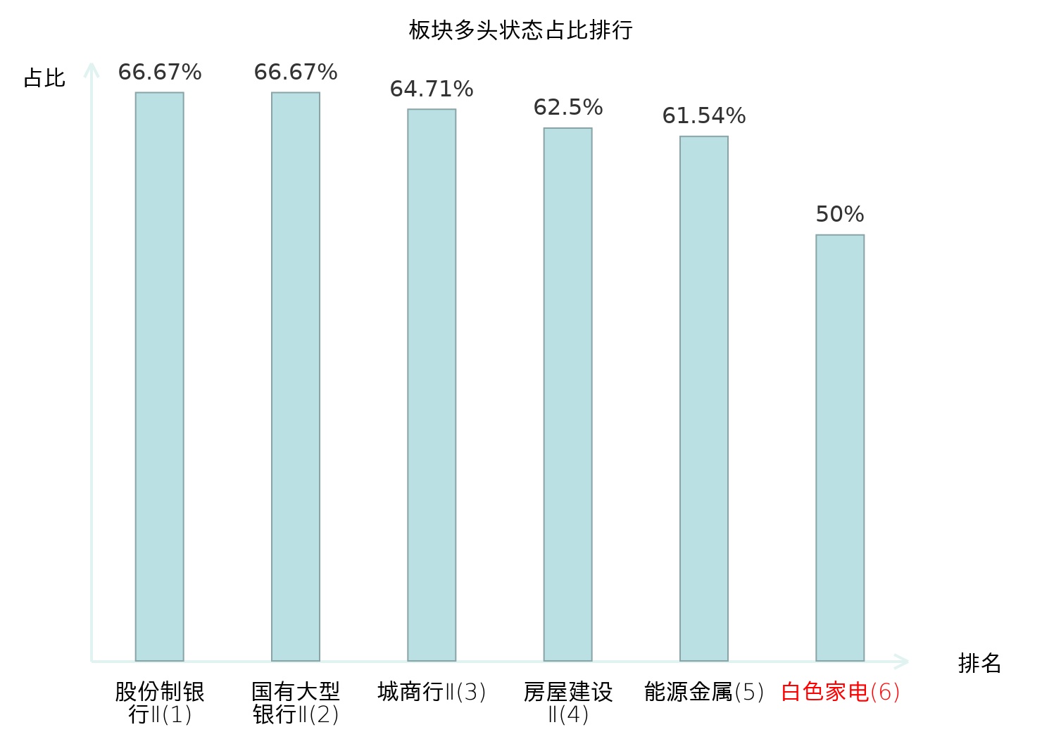 全市场所有行业板块中主力多头状态占比排名中,股份制银行Ⅱ板块位居第一。其他家电Ⅱ板块名次提升最快,较昨日上升102位。