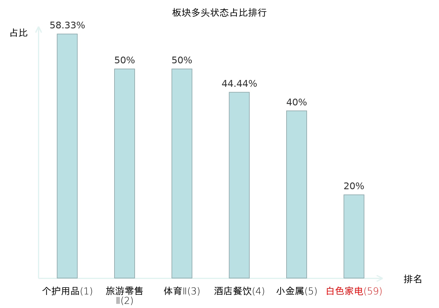 全市场所有行业板块中主力多头状态占比排名中,个护用品板块位居第一。乘用车板块名次提升最快,较昨日上升87位。