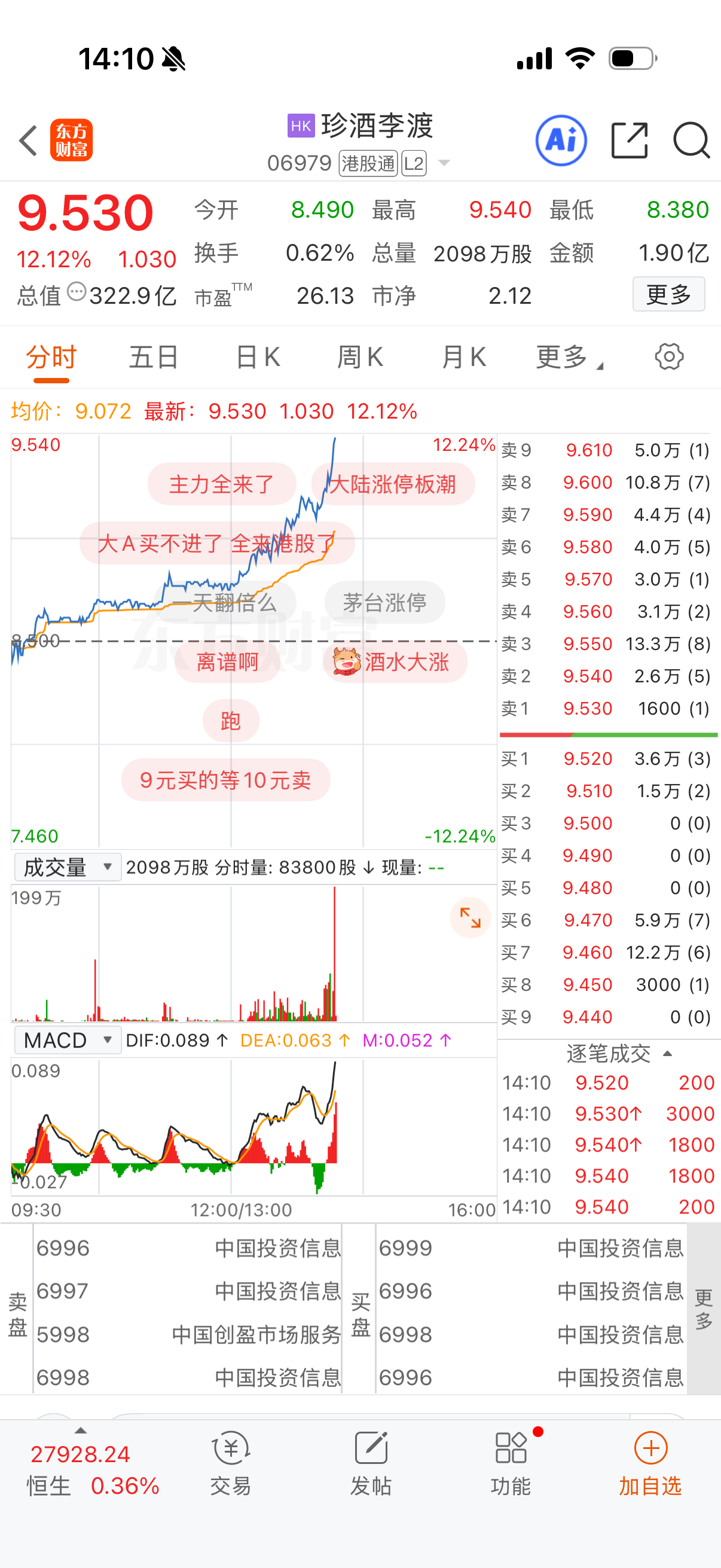上证报中国证券网讯1月29日午后,珍酒李渡一度涨超12%,截至14时10分,涨12.12%,报9.53港元/股。