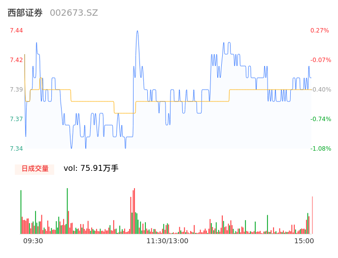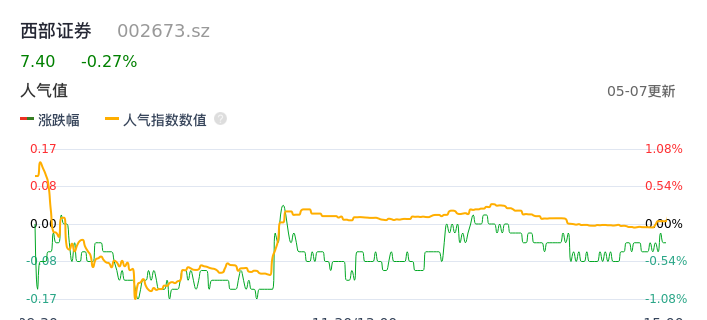 05月07日,西部证券收报7.40,股价涨幅-0.27%,成交金额5.61亿元,换手率1.85%。