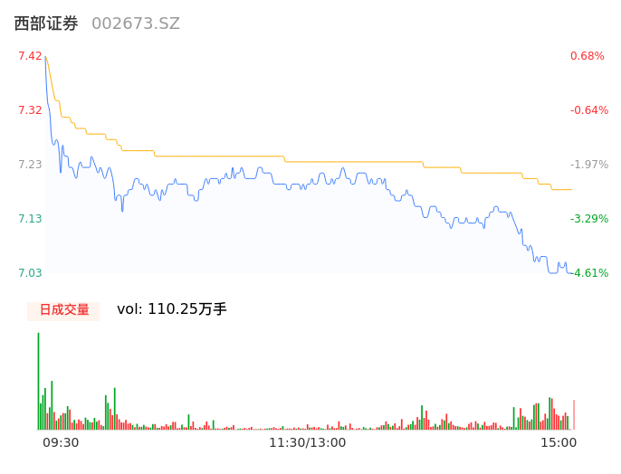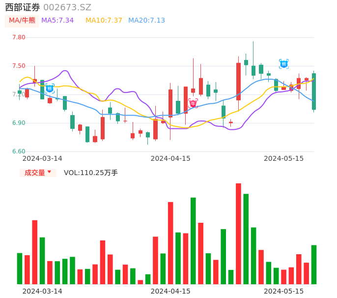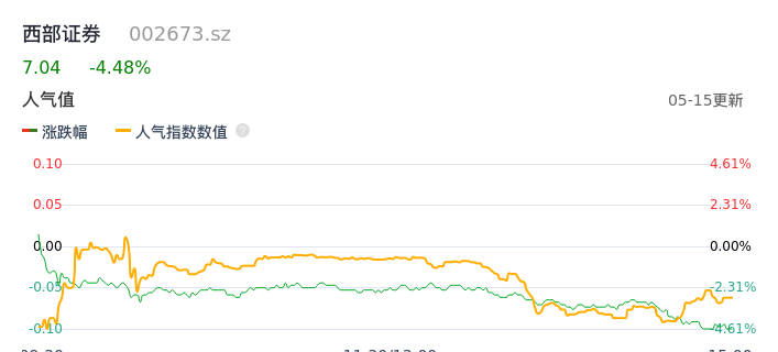 05月15日,西部证券收报7.04,股价涨幅-4.48%,成交金额7.91亿元,换手率2.68%。
