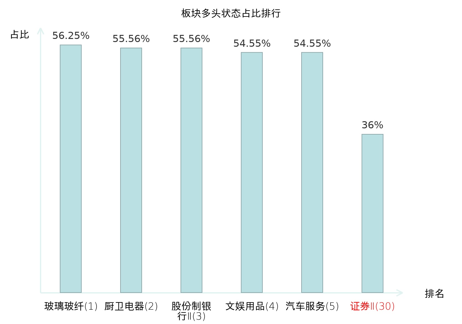 全市场所有行业板块中主力多头状态占比排名中,玻璃玻纤板块位居第一。航天装备Ⅱ板块名次提升最快,较昨日上升84位。