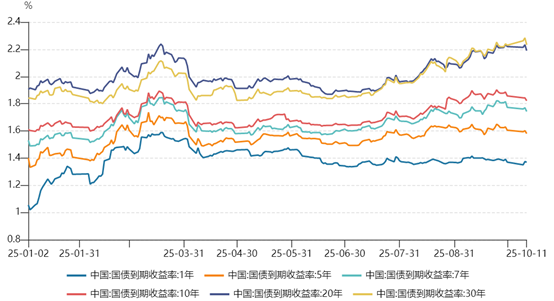 节后,利率债收益率下行。截至10月11日收盘,1Y、5Y、7Y国债分别报收1.37%、1.58%、1.74%,分别较前一周收盘变动0BP、-2BP、-2BP;10Y、20Y、30Y国债分别报收1.82%、2.19%、2.22%,分别较上周收盘变动-3BP、-3BP、-1BP。