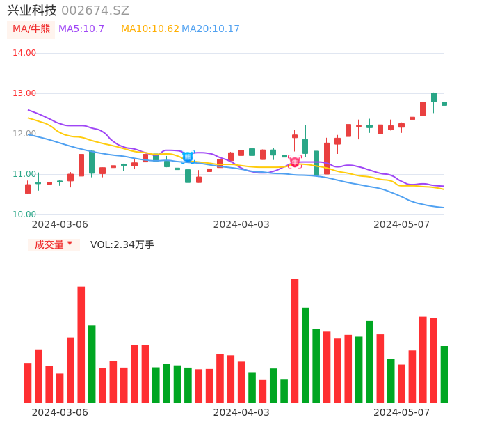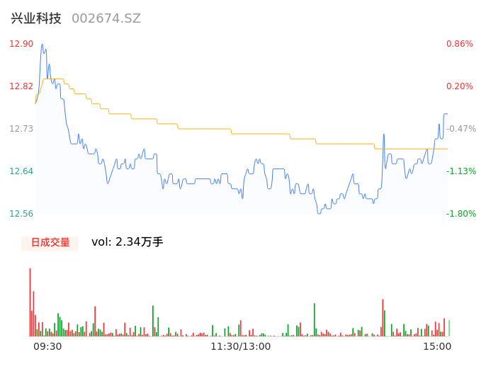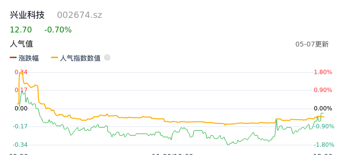 05月07日,兴业科技收报12.70,股价涨幅-0.70%,成交金额2965.69万元,换手率0.81%。