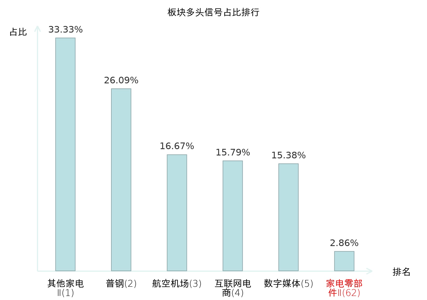 全市场所有行业板块中主力多头信号占比排名中,其他家电Ⅱ板块位居第一。其他家电Ⅱ板块名次提升最快,较昨日上升129位。