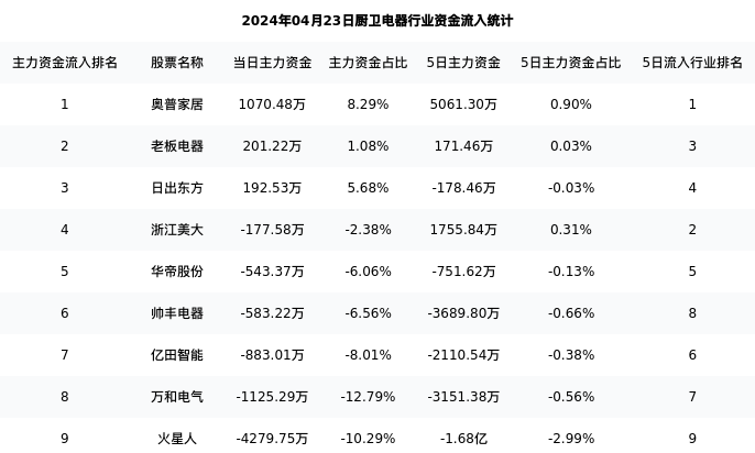浙江美大今日净流出177.58万元,主力占比2.38%,在行业内排名:4/9;5日净流入1755.84万元,主力占比0.31%,在行业内排名:2/9。