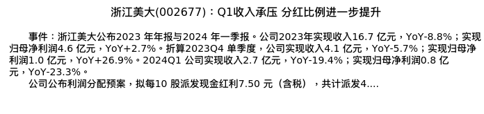 值得注意的是:2024年04月国投证券的李奕臻/杨小天分析师,首次发布关于浙江美大的研究报告,标题为:浙江美大(002677):Q1收入承压 分红比例进一步提升。