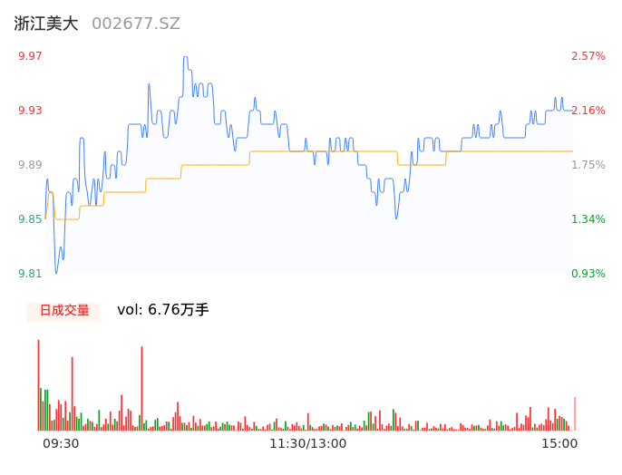05月06日,浙江美大收报9.95,股价涨幅2.37%,成交金额6697.52万元,换手率1.16%。