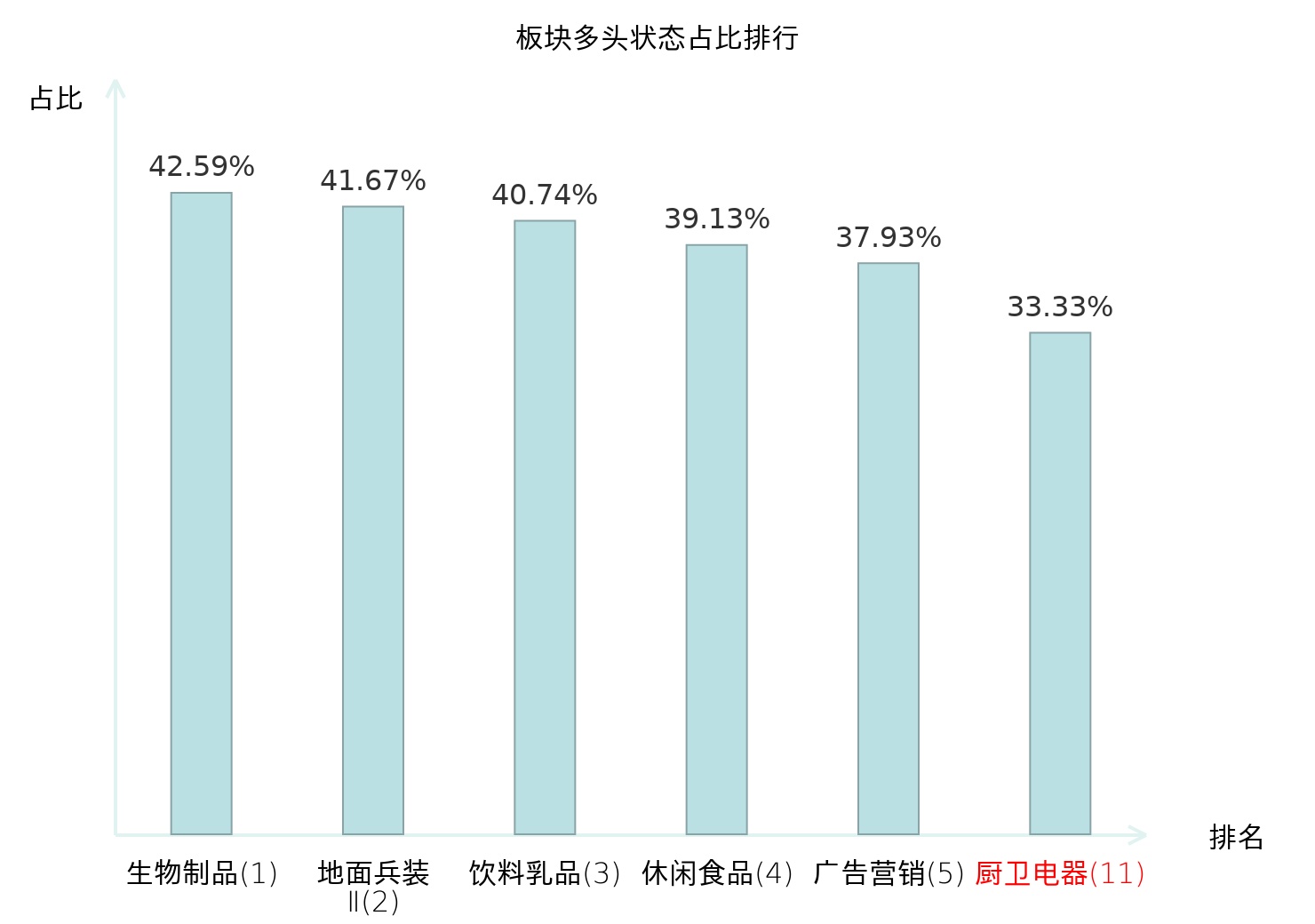 全市场所有行业板块中主力多头状态占比排名中,生物制品板块位居第一。黑色家电板块名次提升最快,较昨日上升65位。