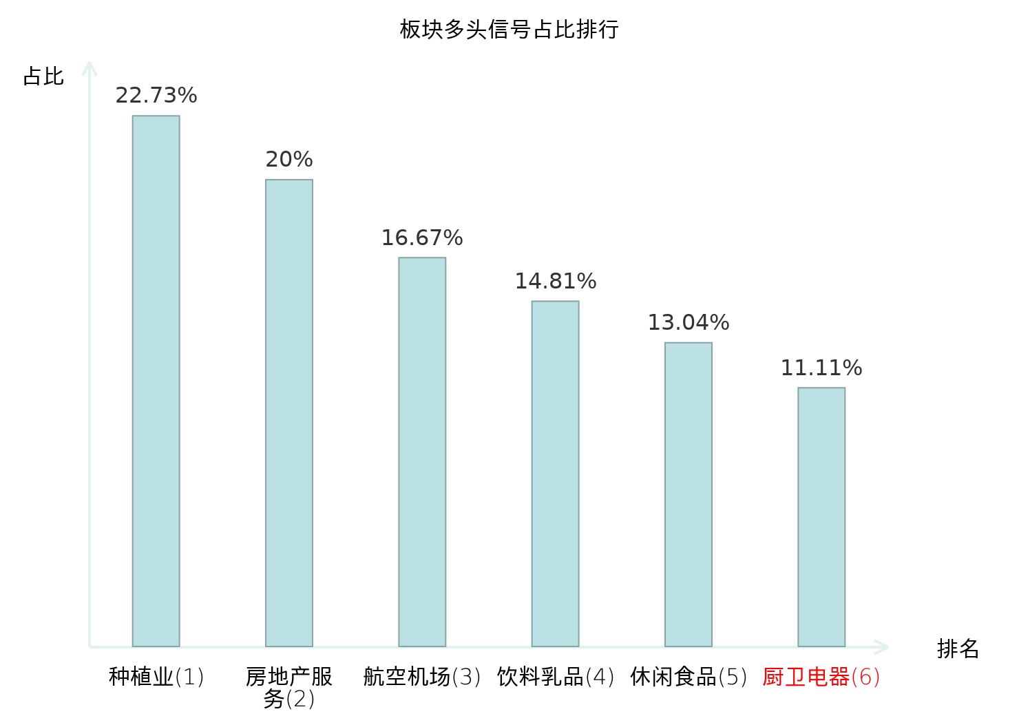 全市场所有行业板块中主力多头信号占比排名中,种植业板块位居第一。厨卫电器板块名次提升最快,较昨日上升109位。