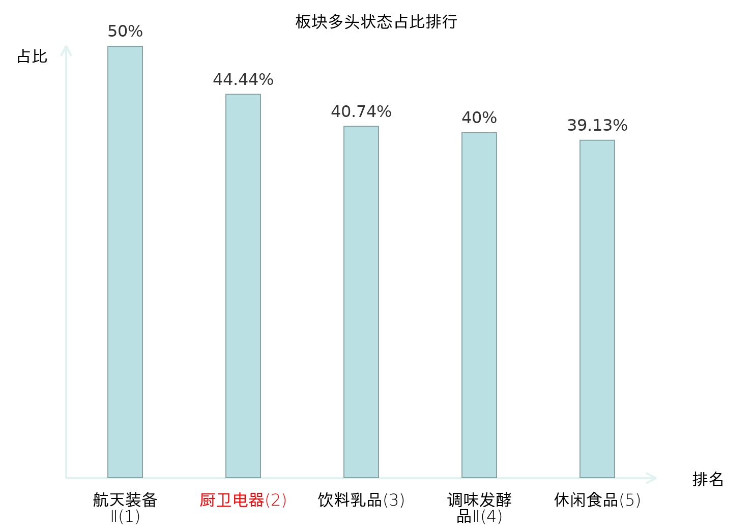 全市场所有行业板块中主力多头状态占比排名中,航天装备Ⅱ板块位居第一。林业Ⅱ板块名次提升最快,较昨日上升92位。