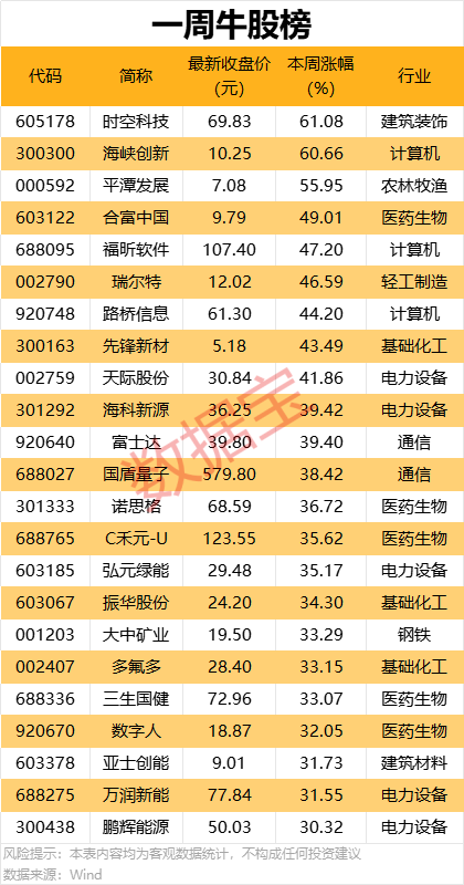 本周涨超30%的个股中,按所属行业统计,电力设备、医药生物均有5股上榜,居前;其次是基础化工、计算机行业,均有3股上榜。