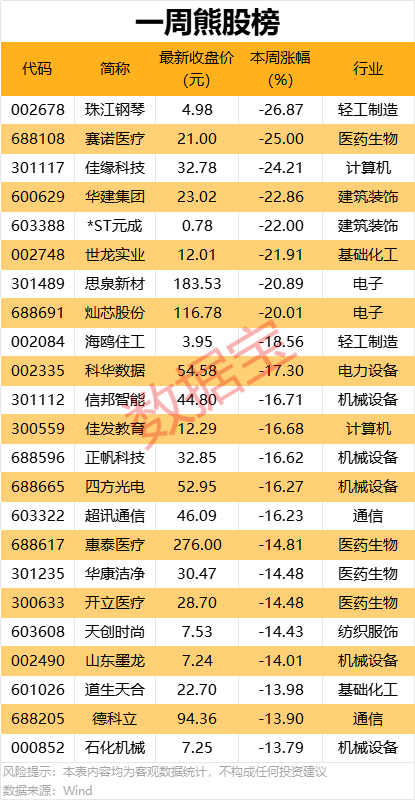 本周累计下跌的个股中,8股跌幅在20%及以上。珠江钢琴累计跌超26%,居首;赛诺医疗、佳缘科技、华建集团、*ST元成等个股累计跌幅也居前。