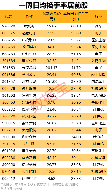 据证券时报·数据宝统计,从本周日均换手率来看,20只A股换手率超过30%,其中,泰凯英、超颖电子、C禾元-U、C必贝特-U、C奕材-U5只个股换手率达五成以上,即超半数筹码易主。