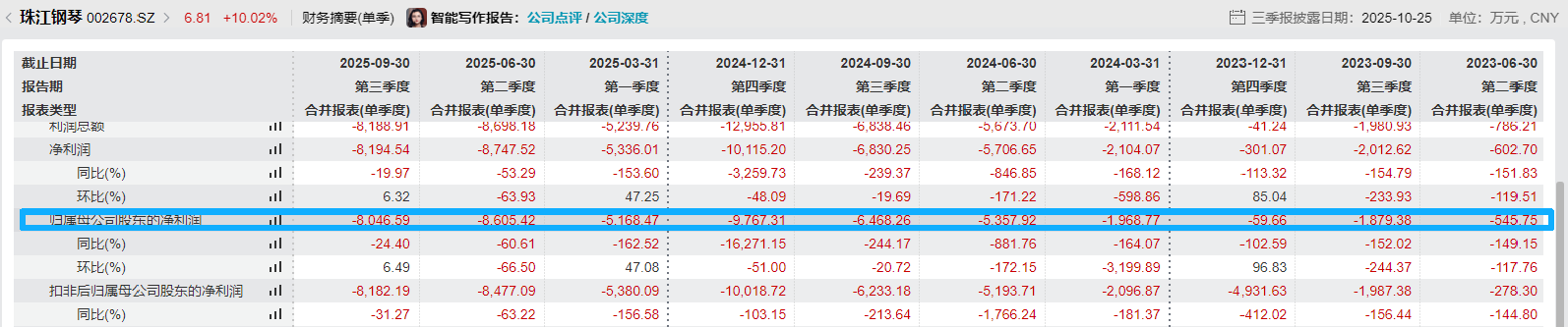 上证报中国证券网讯10月24日晚间,珠江钢琴发布2025年三季报。前三季度,公司实现营收为3.86亿元,同比下降26.72%;归母净利润亏损2.18亿元,同比下降58.18%。