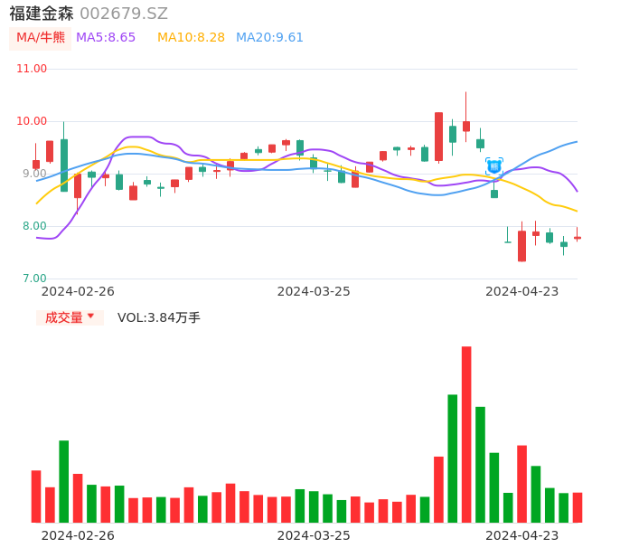 04月23日,福建金森收报7.79,股价涨幅2.37%,成交金额3009.55万元,换手率1.63%。