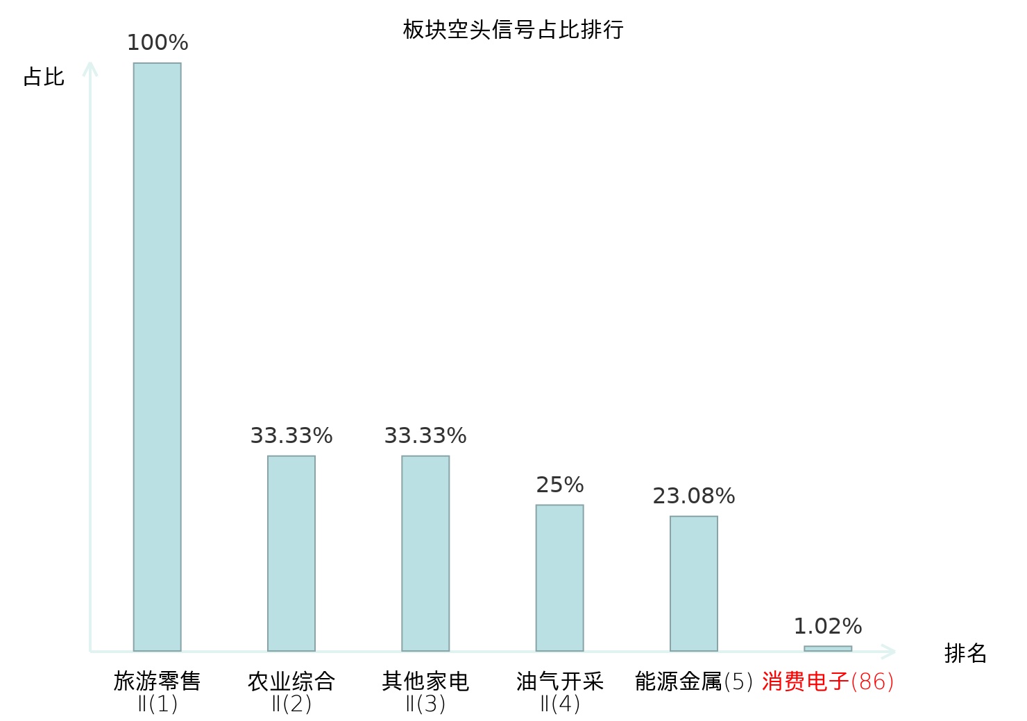全市场所有行业板块中主力空头信号占比排名中,旅游零售Ⅱ板块位居第一。影视院线板块名次提升最快,较昨日上升105位。