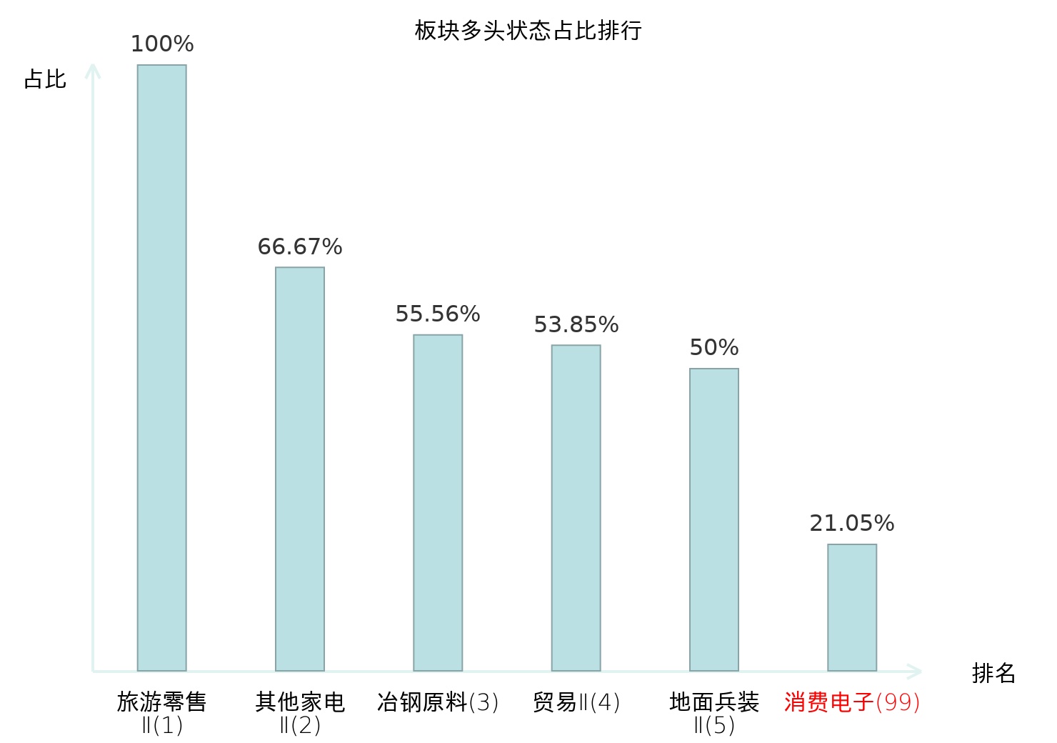 全市场所有行业板块中主力多头状态占比排名中,旅游零售Ⅱ板块位居第一。房屋建设Ⅱ板块名次提升最快,较昨日上升58位。