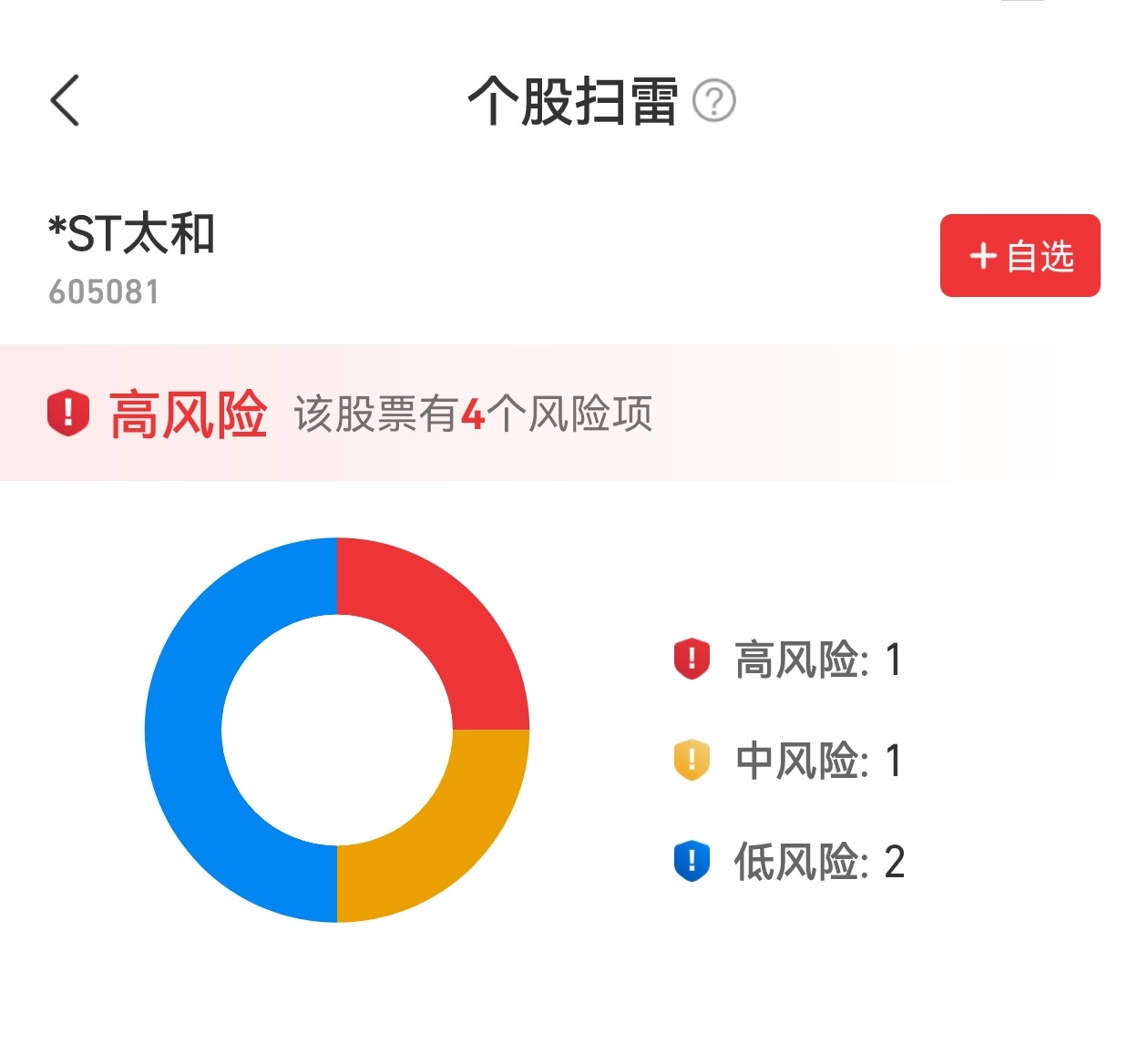 小九借助牛牛避雷宝,又特别查看了一下*ST太和,发现该股不仅仅计划减持,还有显示有1个高风险、1个中风险、2个低风险等多个风险项(如下图所示),具体风险详情点击查看。
