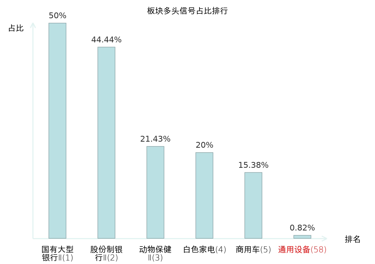 全市场所有行业板块中主力多头信号占比排名中,国有大型银行Ⅱ板块位居第一。房屋建设Ⅱ板块名次提升最快,较昨日上升114位。