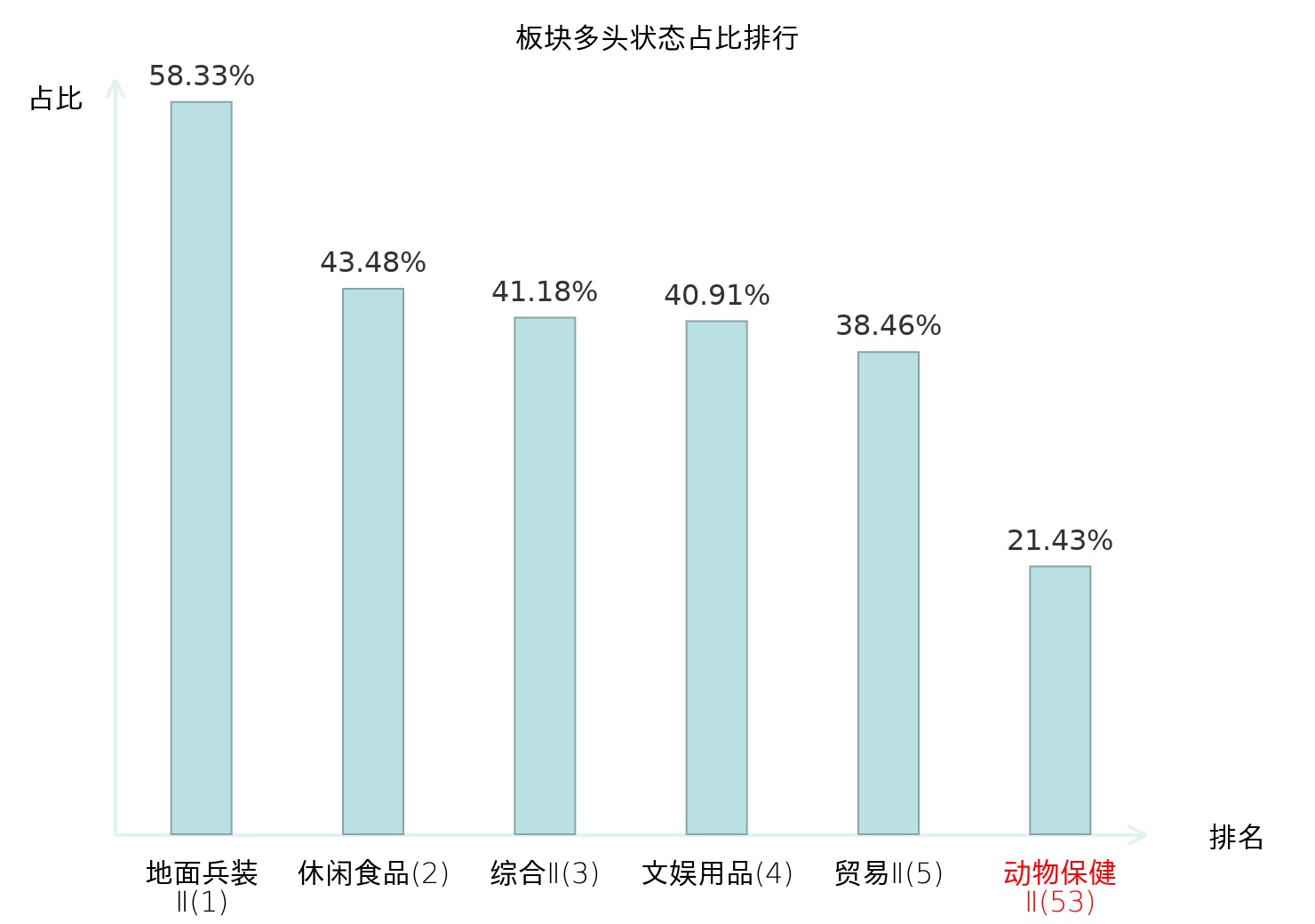 全市场所有行业板块中主力多头状态占比排名中,地面兵装Ⅱ板块位居第一。林业Ⅱ板块名次提升最快,较昨日上升90位。