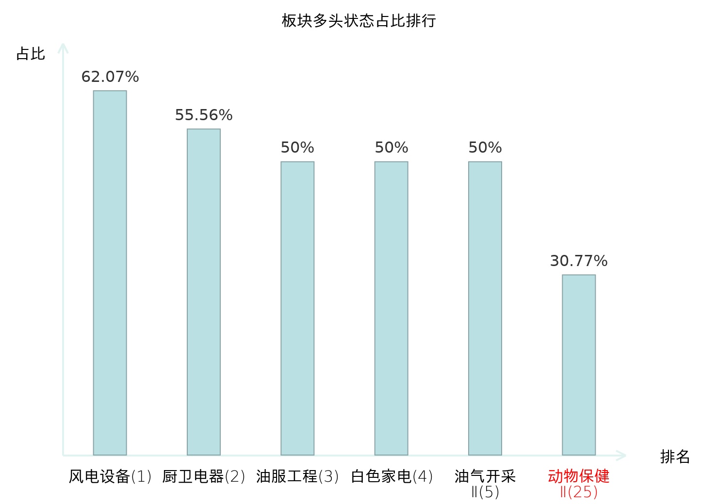 全市场所有行业板块中主力多头状态占比排名中,风电设备板块位居第一。专业连锁Ⅱ板块名次提升最快,较昨日上升65位。