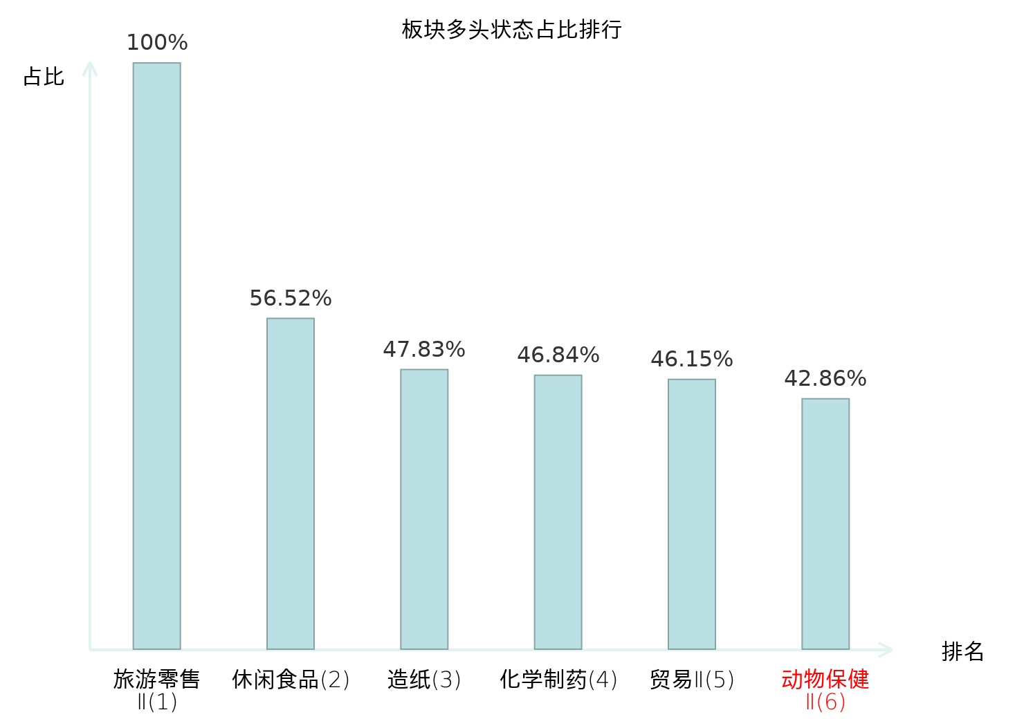 从主力宝信号数据分析,金河生物所属的动物保健Ⅱ板块中共6只股票处于主力多头状态,主力多头状态占比在全行业中排名第6位,较昨日上升58位。排名的显著上升表明主力对于该板块整体看多意愿增强,这可能为投资者提供了关于市场情绪和潜在投资机会的重要线索。全市场所有行业板块中,旅游零售Ⅱ板块的主力多头状态占比最高,位居第一;动物保健Ⅱ板块名次提升最快,较昨日上升58位。这些变动显示了主力资金在不同行业间的偏好调整,有助于投资者更好地理解市场的动态和趋势。