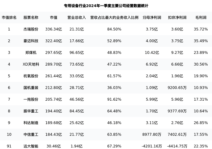 远大智能最新报告期数据为一季度,下表汇总了专用设备行业内市值靠前的公司一季度主要经营数据
