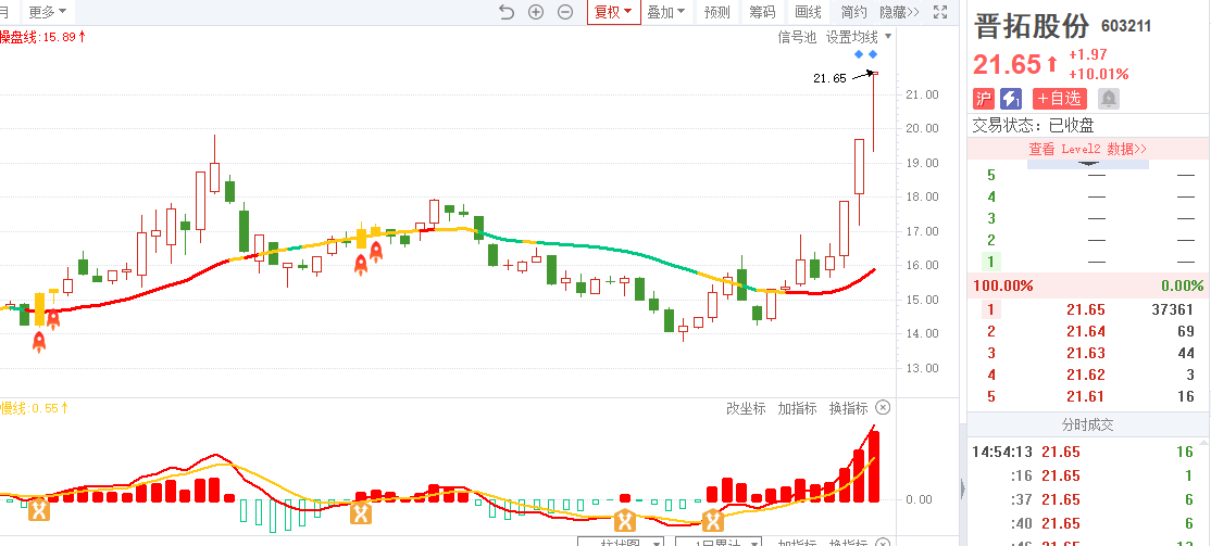 2)晋拓股份-四维操盘-近期出现火箭信号且底部量柱由绿转红
