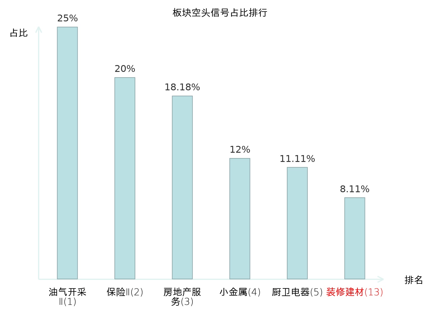 全市场所有行业板块中主力空头信号占比排名中,油气开采Ⅱ板块位居第一。装修建材板块名次提升最快,较昨日上升117位。